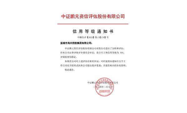 2月9日,中證鵬元資信評(píng)估股份有限公司發(fā)布《信用等級(jí)通知書》中鵬信評(píng)【2024】第Z【179】號(hào),確定鹽城市海興控股集團(tuán)有限公司主體信用等級(jí)為 AAA,評(píng)級(jí)展望為穩(wěn)定。2024-02-09 -